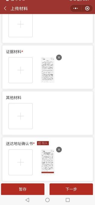 NO.9第九步:上传立案所需的材料至对应的类别中,将所有带*的内容上传完毕后,再进行下一步的操作。(注:在上传送达地址确认书时,可以选择引入,填写信息后生成电子送达确认书)以上上传材料请上传清晰照片或图片,以便后期法院工作人员审核时能避免因材料不清晰带来不必要的退案。