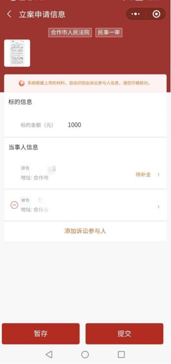 NO.10第十步:如出现待补全,点击进去补充基本身份信息后保存,再添加诉讼参与人(被告),所有信息填写完毕后点击提交→确定。