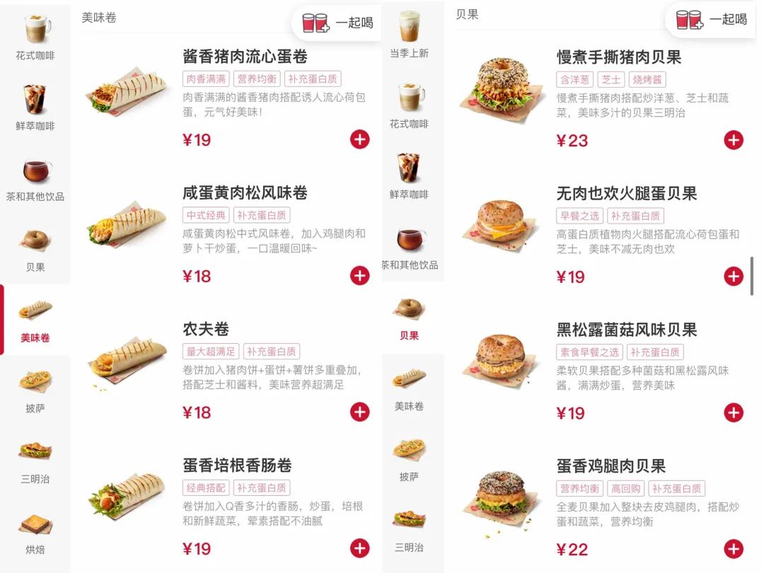 西餐显然是跨度最小的一个方向,品牌基本上是只需要进一步去增加烘焙类SKU就能够覆盖到午餐,比如星巴克和瑞幸自去年下半年加大烘焙端供给,以可颂、贝果、卷、汉堡、三明治满足午餐需求。事实上不少海外咖啡品牌在其原本的市场上也一直都有布局,经验可以完全复制,Tims中国CEO卢永臣就表示咖啡+暖食的组合是延续了Tim Hortons在加拿大的传统。