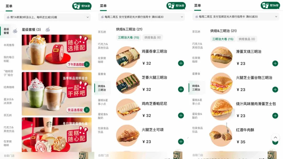 但引人注目的是,咖啡品牌对于甜品烘焙的更新速度在提升,同时在套餐搭配上也更下功夫。比如Tims会根据中国口味做川香灯影牛肉卷和咸蛋黄肉松风味卷,也会让原本更多只是抹酱或者加奶酪的贝果,像是汉堡一样有了更多口味。而在各种节日到来时,新品或者新套餐就可能会更多,比如星巴克的棒棒糖花束,Tims的19.9元情人节下午茶套餐等等。