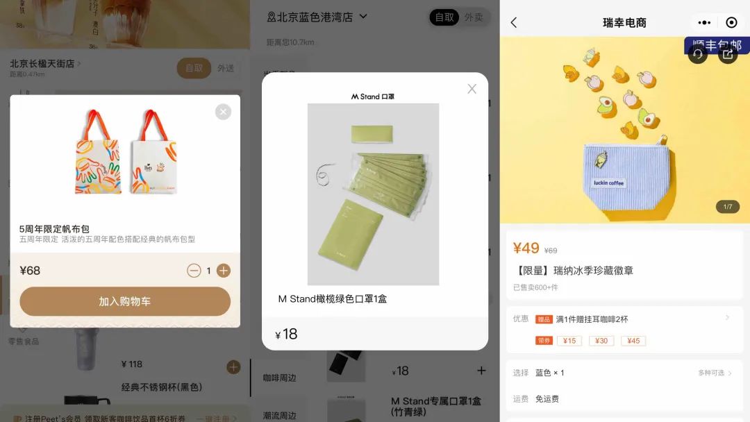 图源:Peet's coffee、M Stand、瑞幸咖啡小程序从以上诸多品牌的玩法来看,做周边的价值有两重。