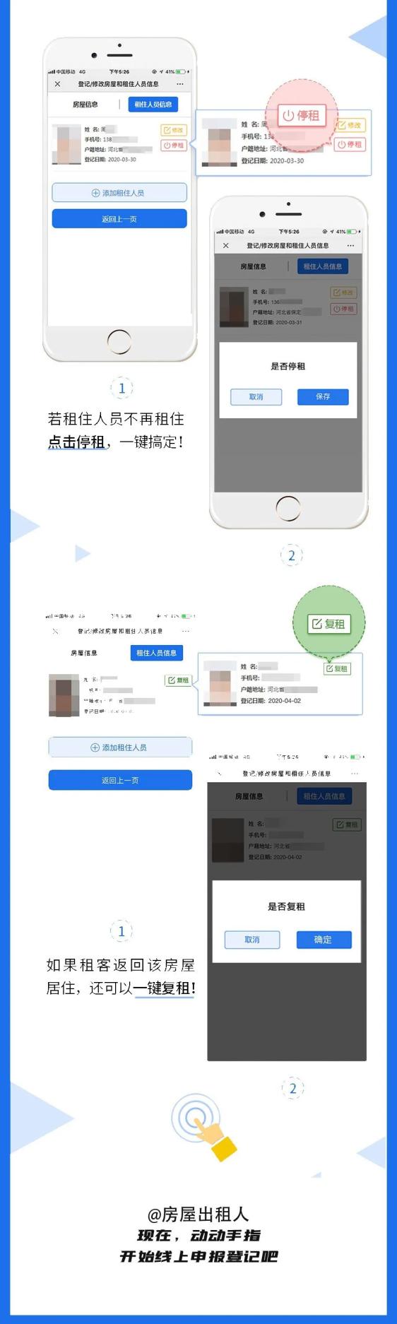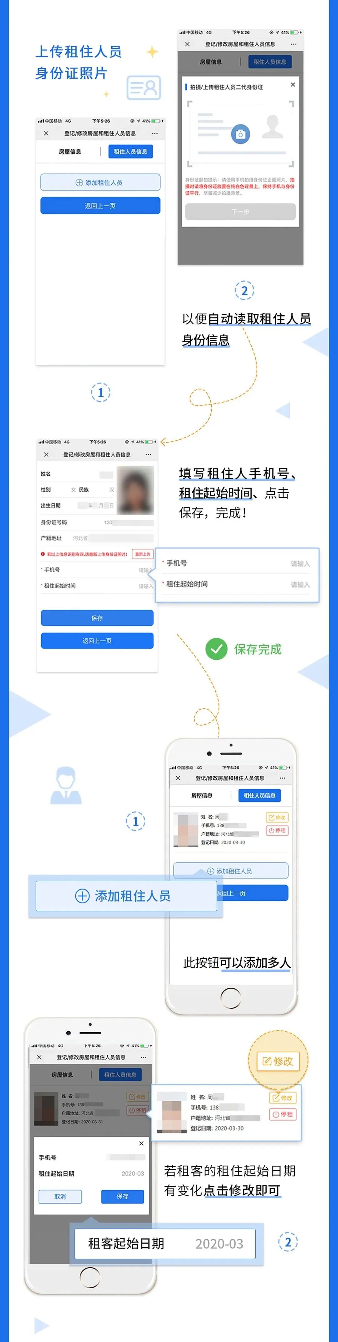 房屋出租人应当自住房租赁合同订立之日起三个工作日内,到住房所在地的流动人口基层管理服务机构或者通过公安机关指定的信息系统办理出租登记,填报租赁住房信息和出租人、承租人以及其他实际居住人员信息等内容;居住人员发生变更的,出租人应当自变更之日起二个工作日内办理变更登记手续。
