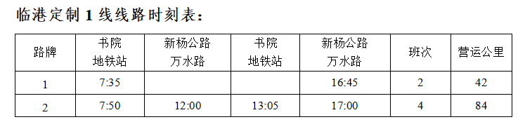 线路全长21公里,从书院地铁站到新杨公路万水路双向行驶,单程行驶时间50分钟,周一至周五有固定的6班运营班次,双休停运。