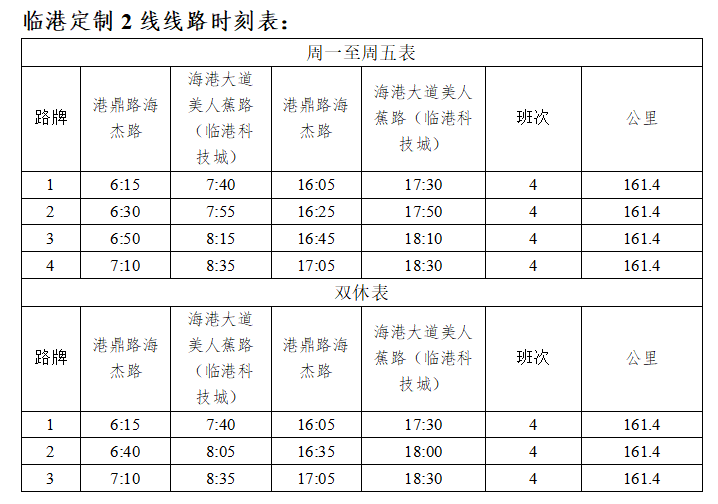 首末班车时间:海港大道美人蕉路(临港科技城)7:40-18:30;港鼎路海杰路6:15-17:05,发车间隔为15-20分钟,低谷时段停运,全线采用早晚高峰的方式运营。