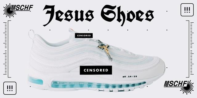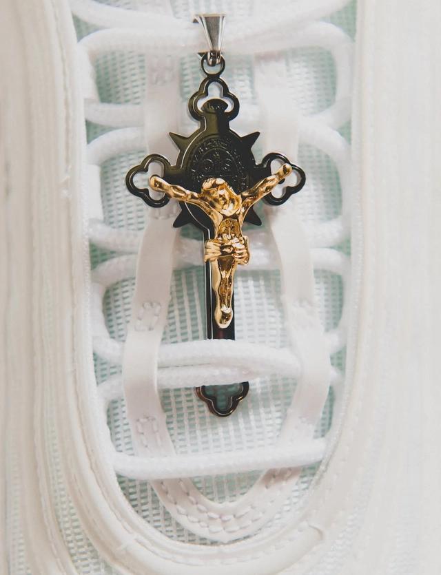 “啃食”着富豪的脸,不知道996打工人有没有亿一点点爽MSCHF团队还在2019年的时候恶搞过Nike。他们把Nike最经典的Nike Air Max 97通过一系列操作改造成了“耶稣鞋”:不但在品牌引以为傲的鞋底气垫里注入了约旦河的水,还在鞋舌上面配上了十字架吊坠,鞋边印着“MT.14:25”(马太福音里讲述耶稣水上行走的章节)。
