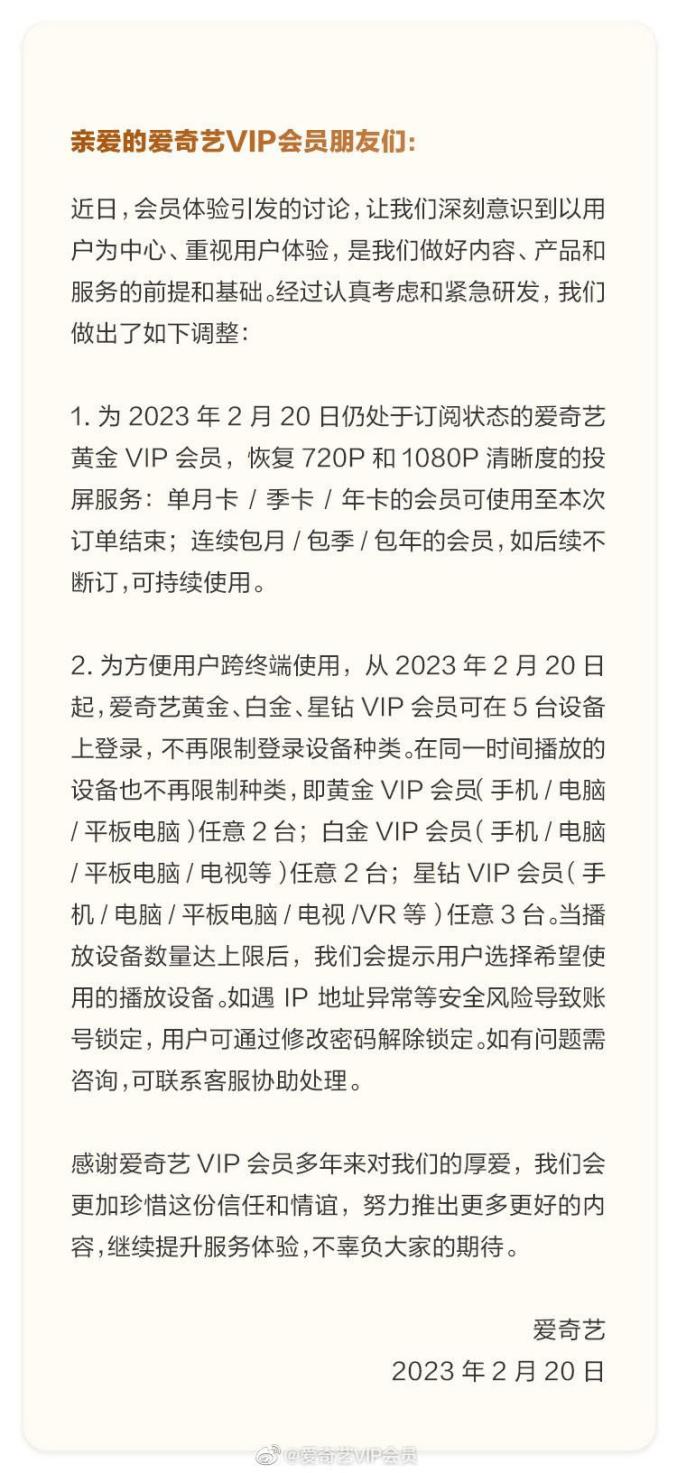 1.为2023年2月20日仍处于订阅状态的爱奇艺黄金 VIP会员,恢复720P和1080P清晰度的投屏服务:单月卡/季卡/年卡的会员可使用至本次订单结束;连续包月/包季/包年的会员,如后续不断订,可持续使用。