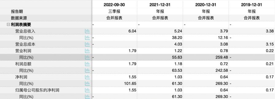 2019年-2021年以及2022年1-9月,博苑股份的营业总收入分别为3.38亿元、3.79亿元、5.24亿元和6.04亿元;其中2020年和2021年同比增长率分别为12.16%和38.20%;同期归母净利润分别为0.17亿元、0.64亿元、1.03亿元和1.55亿元,其中2020年和2021年同比增长率分别为269.30%和61.30%。