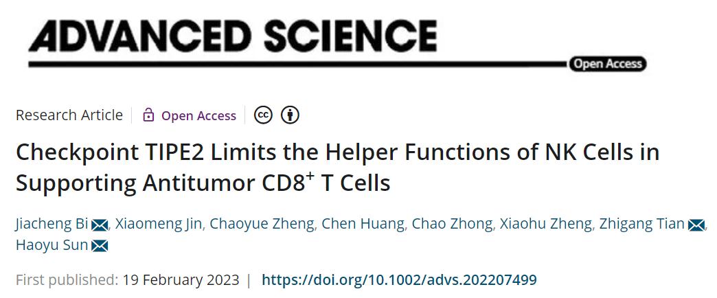 NK细胞不仅是抗肿瘤的直接效应细胞,而且对于抗肿瘤T细胞应答及基于T细胞的卡控点免疫疗法还发挥重要的辅助作用。但目前NK细胞辅助T细胞的内在分子机制并不清楚。2023年2月19日,中国科学技术大学田志刚院士、孙昊昱教授及中国科学院深圳先进技术研究院合成生物学研究所毕嘉成副研究员等人在 Advanced Science 期刊发表了替我:Checkpoint TIPE2 limits the helper functions of NK cells in supporting antitumor CD8+ T cells 的研究论文。