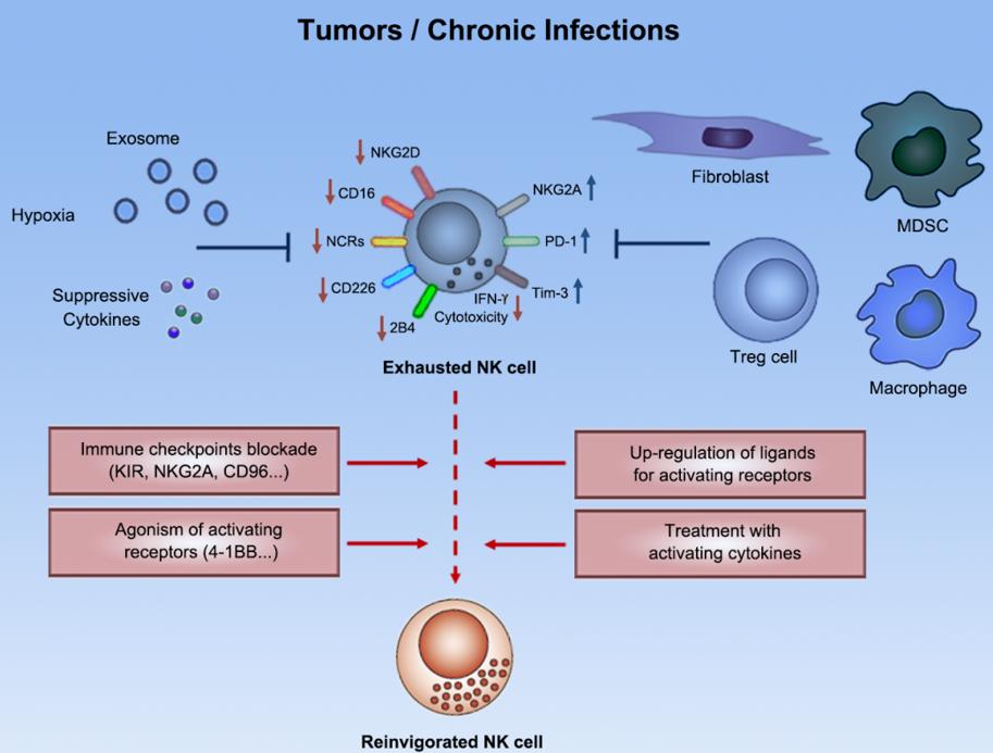 图1. NK细胞在肿瘤微环境中进入功能低下的“免疫耗竭”状态NK细胞是一种固有免疫细胞,通过杀伤靶细胞、诱导靶细胞凋亡或分泌细胞因子来发挥对肿瘤的免疫监视功能。大量研究早已显示NK细胞不仅在控制血液系统肿瘤及肿瘤转移中发挥关键作用,而且NK细胞在实体肿瘤中的浸润水平也与患者的预后密切相关。NK细胞在当前的肿瘤免疫治疗研究中具有重要的地位,因为NK细胞不仅能识别并杀伤HLA低表达等逃逸T细胞应答的肿瘤细胞类型,而且NK细胞对基于T细胞的免疫治疗(如靶向PD-1/PD-L1的“卡控点疗法”)也具有促进作用,此外NK细胞还天然具有作为“通用型”合成免疫细胞疗法底盘细胞的优势。