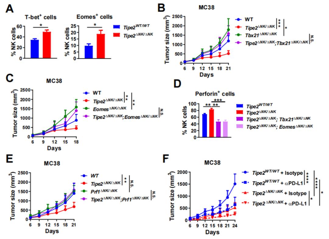 重要的是,团队发现NK细胞中Tipe2缺失对肿瘤生长的抑制效应依赖于NK细胞中表达T-bet、Eomes及perforin,这三者之中任意其一若同时缺失的话,肿瘤将恢复加速生长。另一方面,NK细胞Tipe2缺失能够进一步促进抗PD-L1治疗的抗肿瘤效应,提示二者的作用机制之间存在协同效应(图3)。这些研究表明。NK细胞TIPE2通过抑制转录因子T-bet和Eomes及其下游的效应分子的表达,间接限制了抗肿瘤CD8+ T细胞的功能,提示TIPE2是NK细胞辅助功能的卡控点分子。