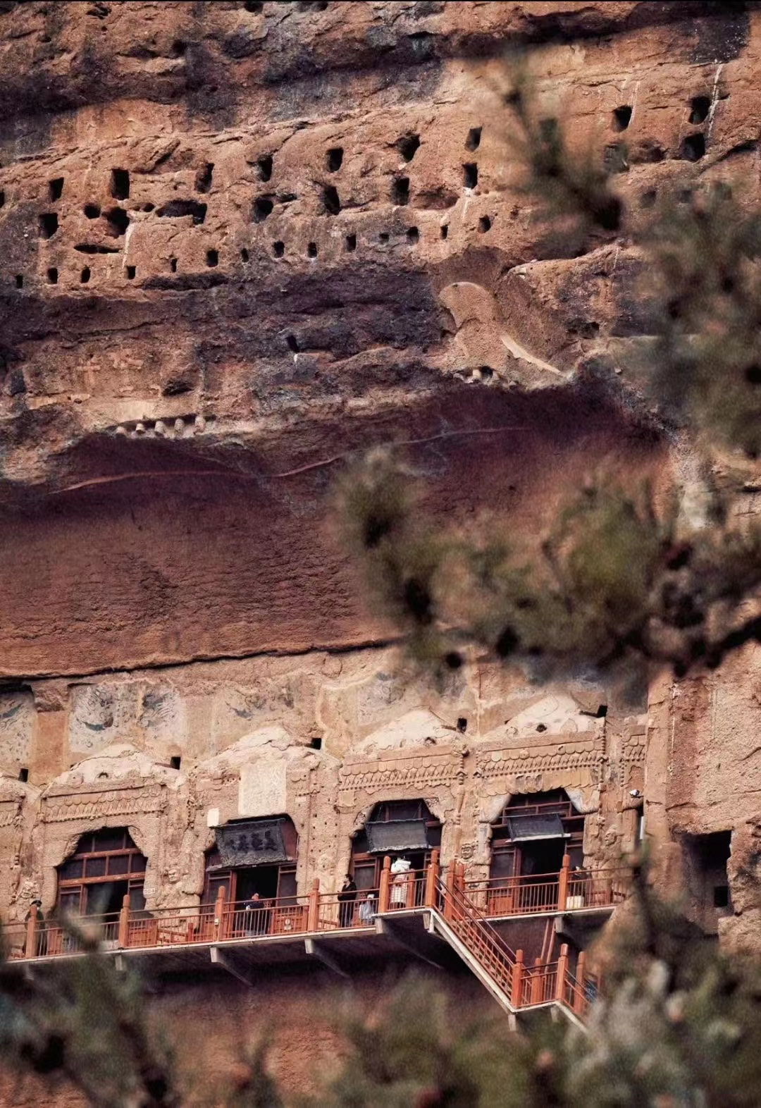 远观之后便是近距离参观佛窟,麦积山石窟的游览路线十分简单,只要沿着山体间修筑的木制栈道层层而上,沿途一座座石窟参观即可。脚下的木制栈道现在好多已用水泥加固,所以向下观看虽会有些刺激吓人,但还是非常安全的。