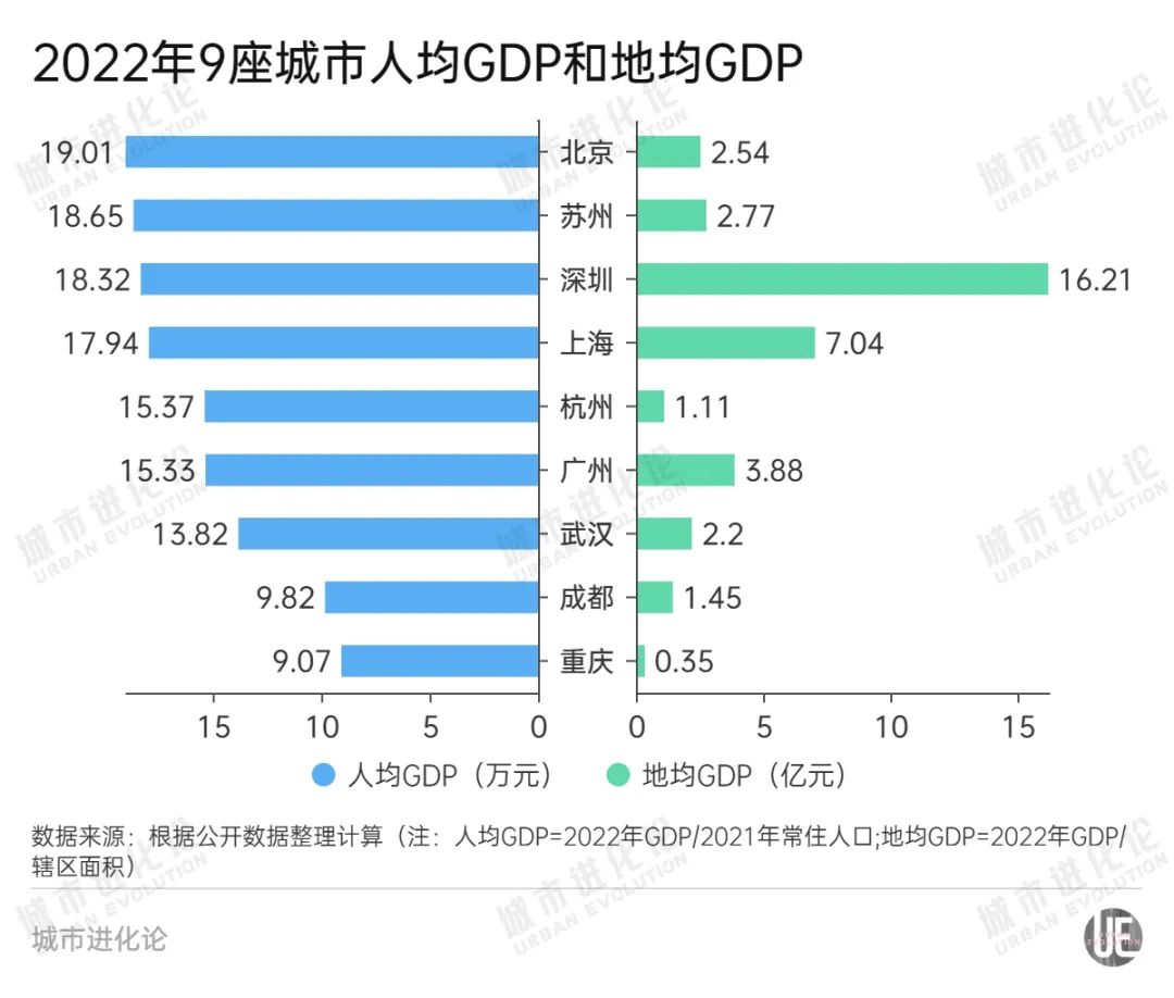 9座城市中,北京2022年人均GDP达到19.01万元,高居榜首,苏州、深圳分别以18.65万元、18.32万元位列第二、三位;重庆、成都分别为9.07万元、9.82万元,排名最后两位,也是唯二尚未突破10万元的城市。