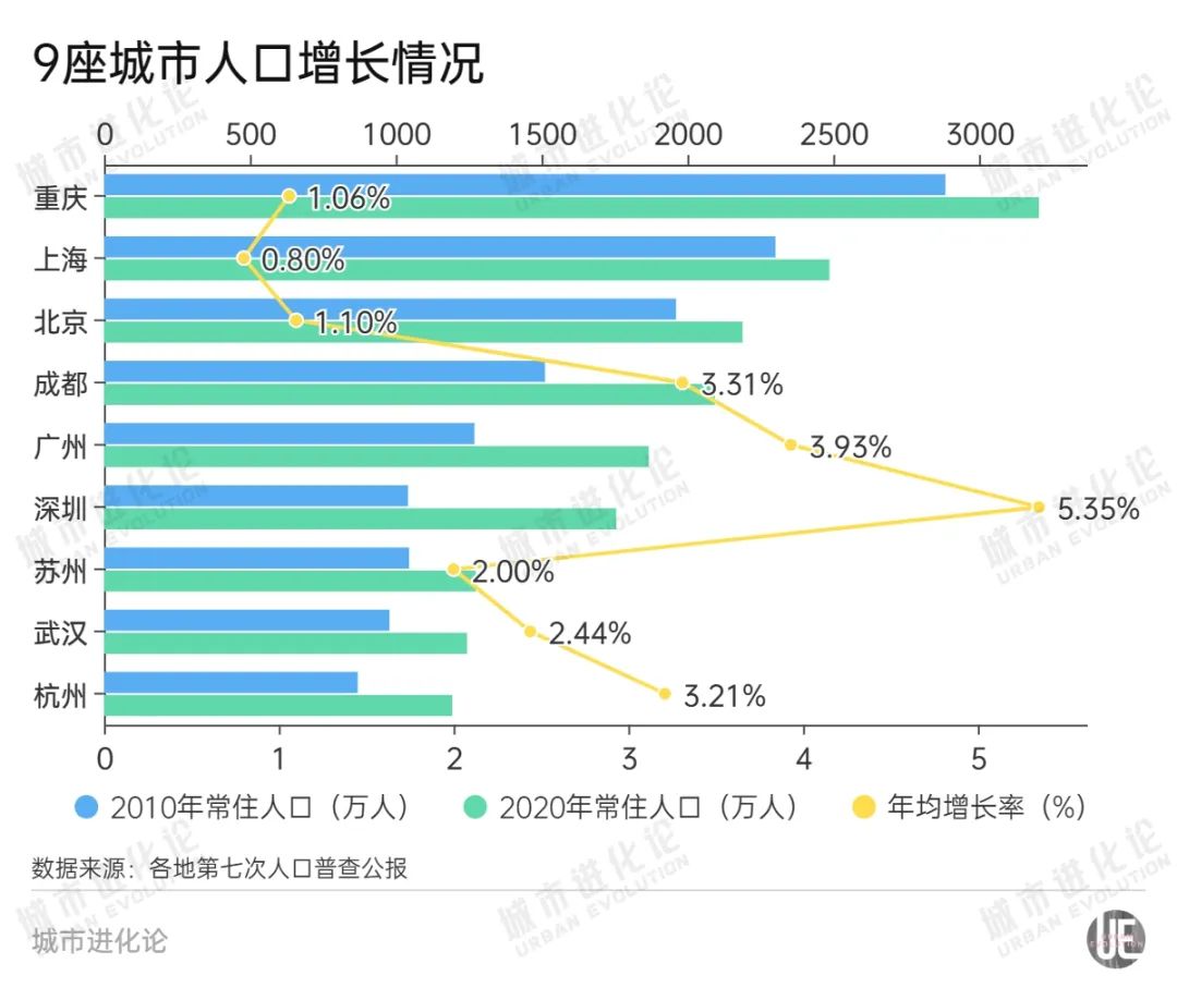 根据第七次人口普查,2010年至2020年,全国600多个城市中,常住人口增长最多的前三名,分别为深圳(713.6万人)、广州(597.6万人)和成都(581.9万人)。
