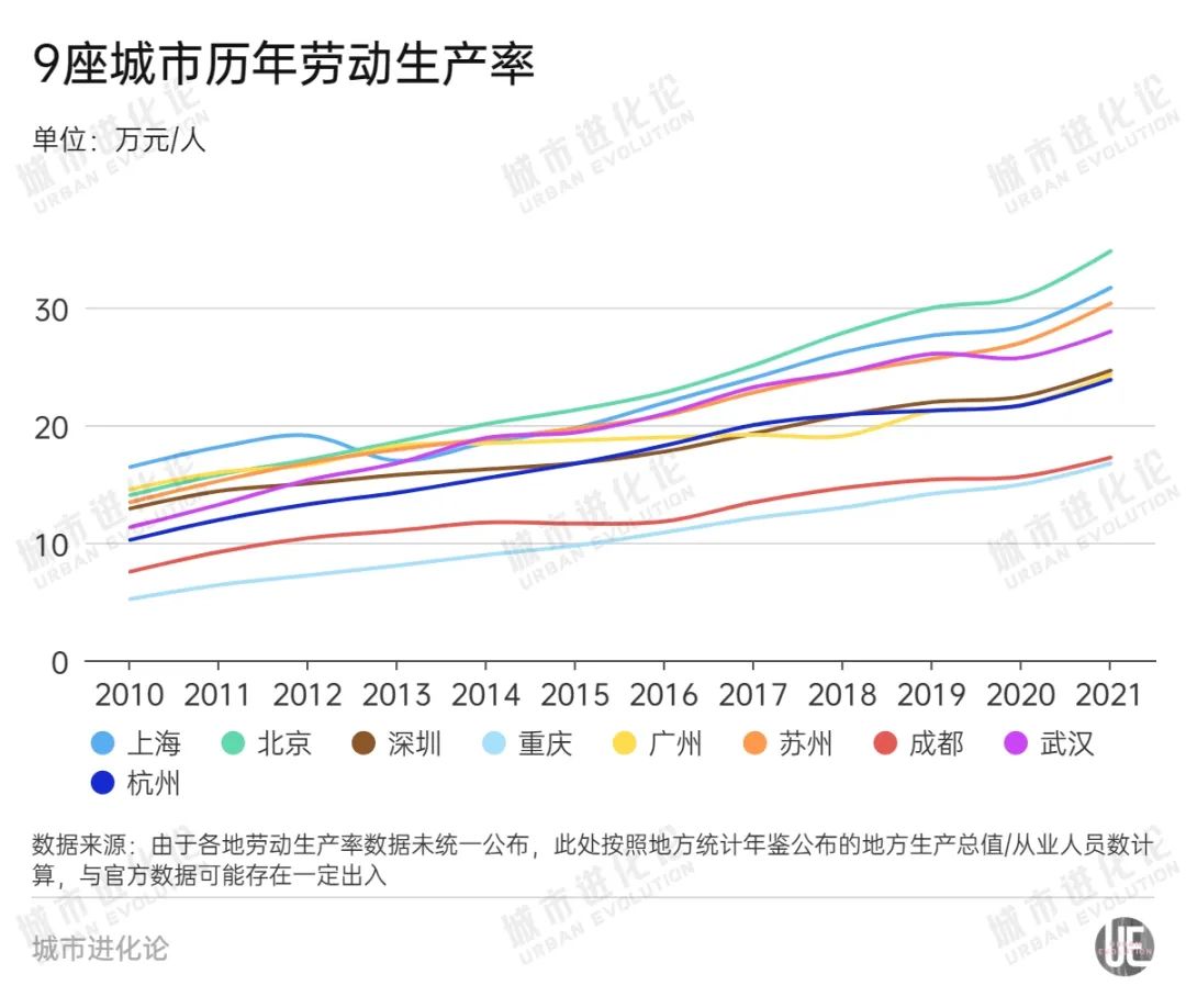 上海、北京、深圳跨越2万亿节点时,劳动生产率分别为18.12万元/人(2011年)、18.58万元/人(2013年)和17.74万元/人(2016年)。2021年,北京和上海GDP同步跨越4万亿,劳动生产率也携手跨过30万元/人,分别达到34.78万元/人和31.66万元/人。