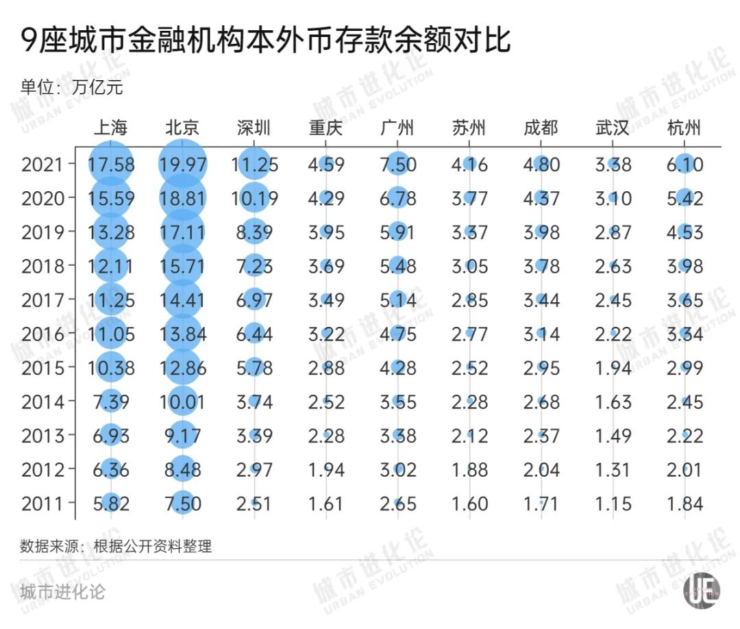 通过金融机构本外币存款余额,即“资金总量”这项指标可以看到,截至2022年底,9座城市共计吸纳全国23.1%的资金总量,接近9城在全国的经济份额占比。