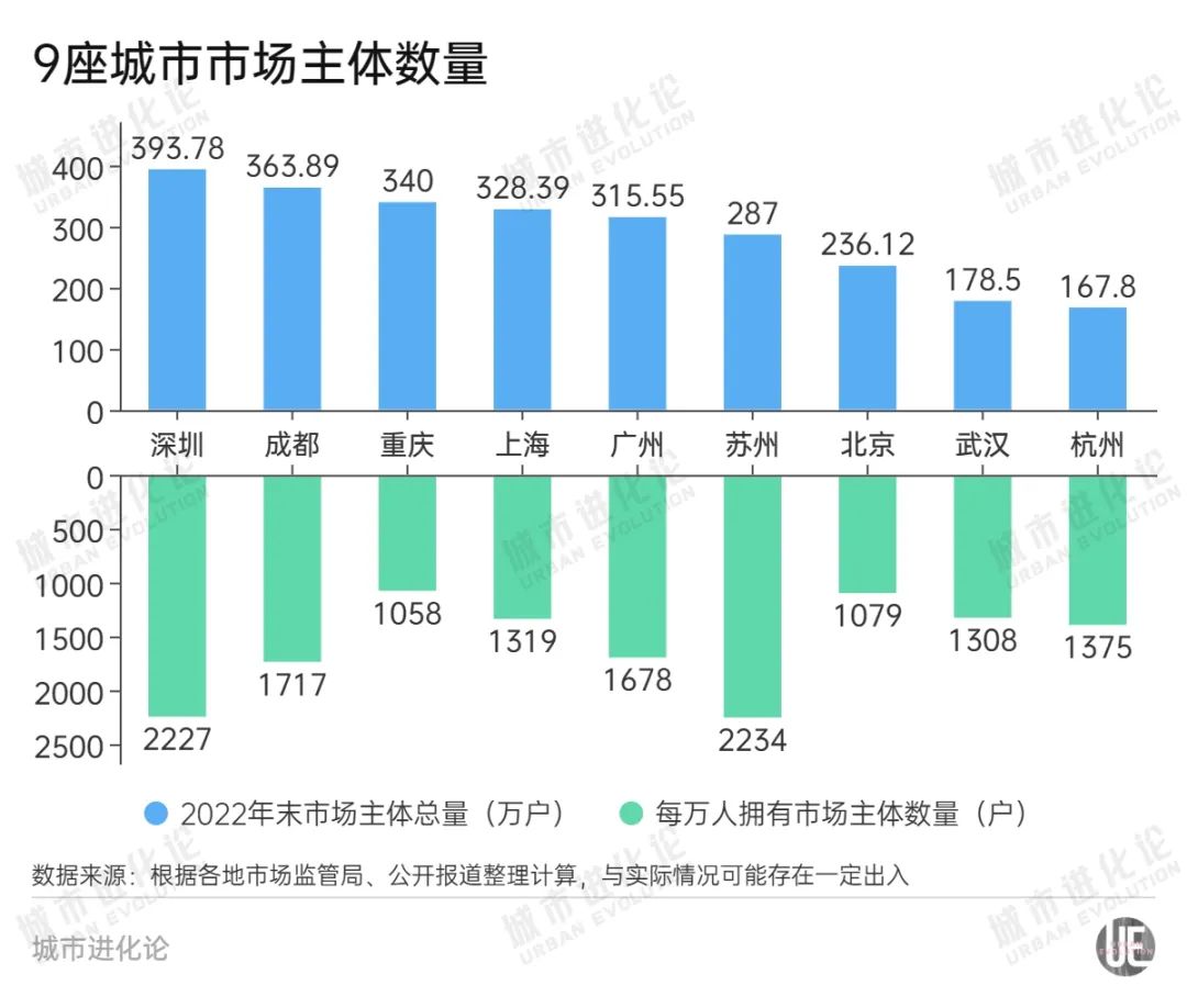 2022年,深圳以新增52.2万户、总量393.78万户的成绩继续位居榜首,成都新增57.94万户、总量363.89万户,排名第二。重庆、上海及广州市场主体也均超过300万户,苏州和北京在200万户量级,武汉和杭州则还处于100万户量级。