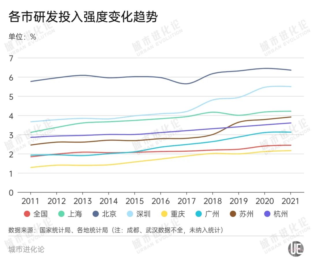 过去十年间,深圳R&D经费投入强度出现过几波明显上涨,向一直保持6%左右强度的北京不断靠近。对应具体时间节点,2016年,深圳研发投入强度首次突破4%;2021年超越3万亿时,已达到5.49%。苏州也有类似成长路径,2018年投入强度超过3%后,第二年再度提升0.64个百分点,2020年以3.78%的投入强度,助力GDP总量完成2万亿跨越。