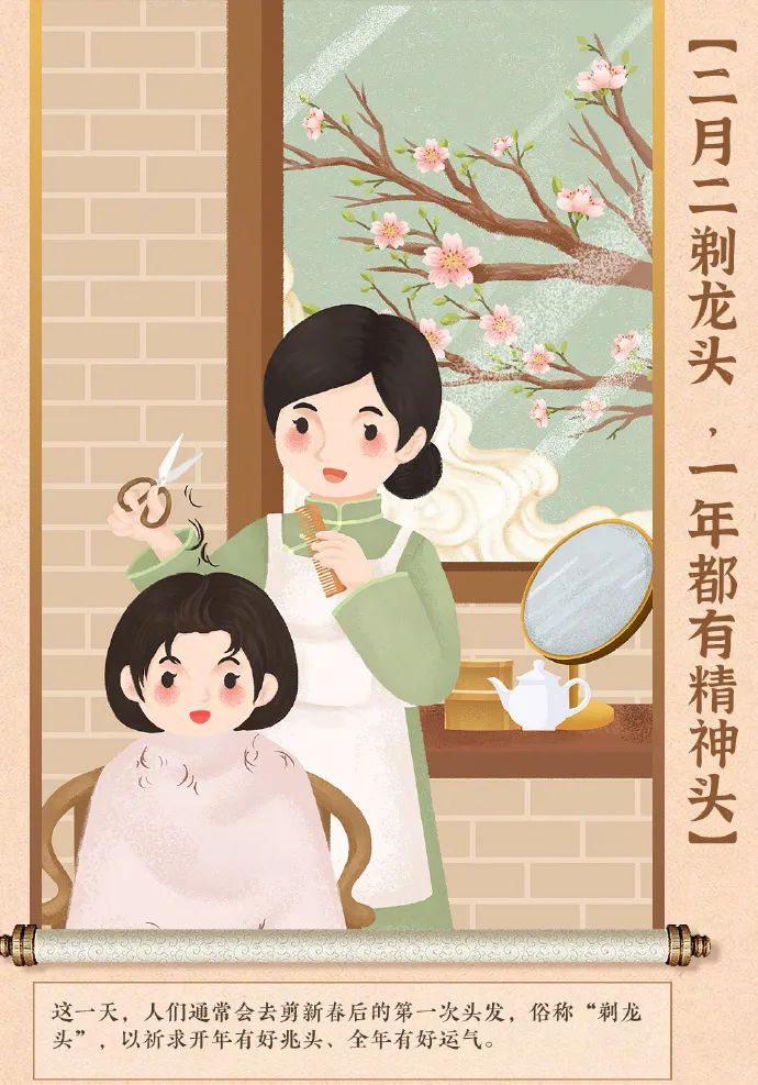 二月二可谓“中国传统理发日”, 民谚云“二月二剃龙头,一年都有精神头”。借龙抬头之吉时,孩子“剃喜头”,健康长大,出人头地。大人“剃龙头”,辞旧迎新,鸿运当头。除了理发,
