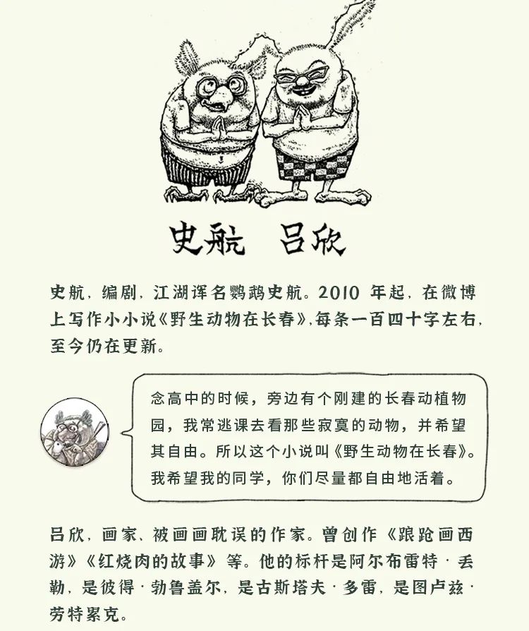按:2015年,《野生动物在长春·第壹辑》系列漫画出版,文字蓝本为编剧史航发表在微博上的小小说,最早收录于《读库1006》。画家吕欣后来以漫画的方式重新演绎,历时近三年,这套堪称国内成人绘本标杆之作的作品面世。第壹辑推出后不久,许多读者朋友便开始期待续集。