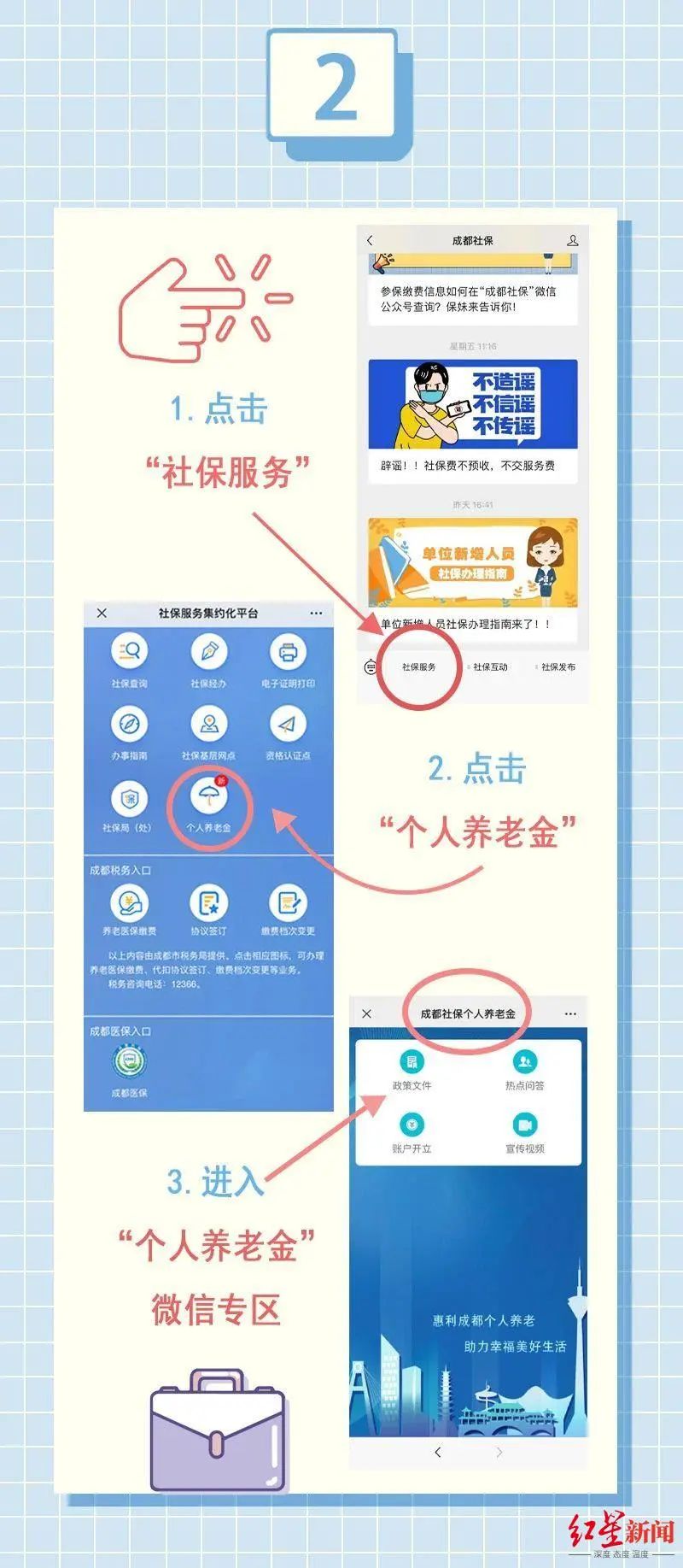 如何让群众看得懂政策、办得成业务、算得清个账?试点工作开展以来,成都在“成都社保”微信公众号开通“个人养老金”特色专区,设置政策文件、热点问答、账户开立、宣传视频等板块,方便大家“一站式”了解政策、办理业务、反馈问题,持续增强办事便捷度和体验感。