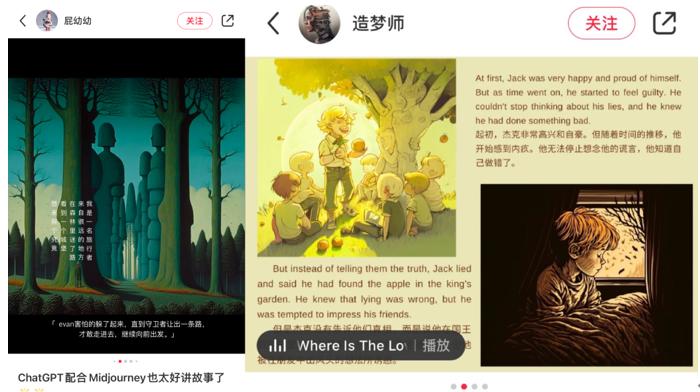 此外,某社交平台上,已经有多位用户分享了自己完全依靠AI生成的故事绘本:文字由ChatGPT代劳,图画则由Midjourney生成。甚至可以中英双语搭配,直接阅读很难察觉其并非出自人类之手。目前还未见有人分享真的以此方式成功在国内出版读物的经历,但可能性已经摆在那里。