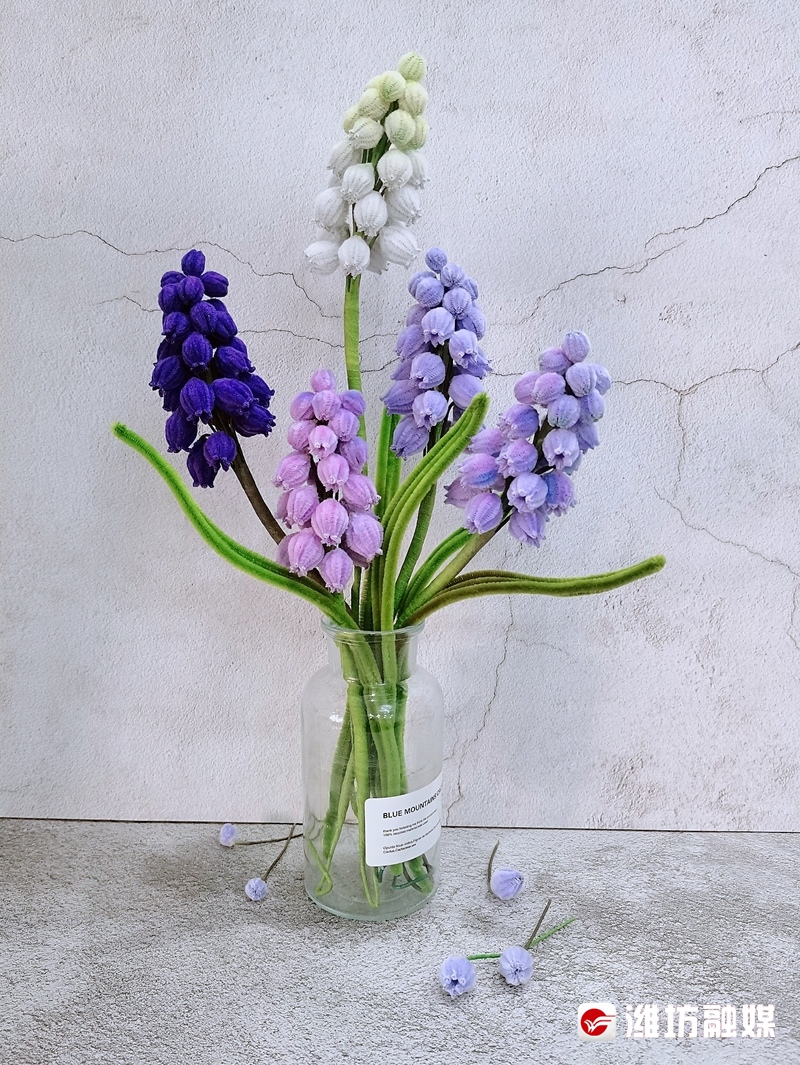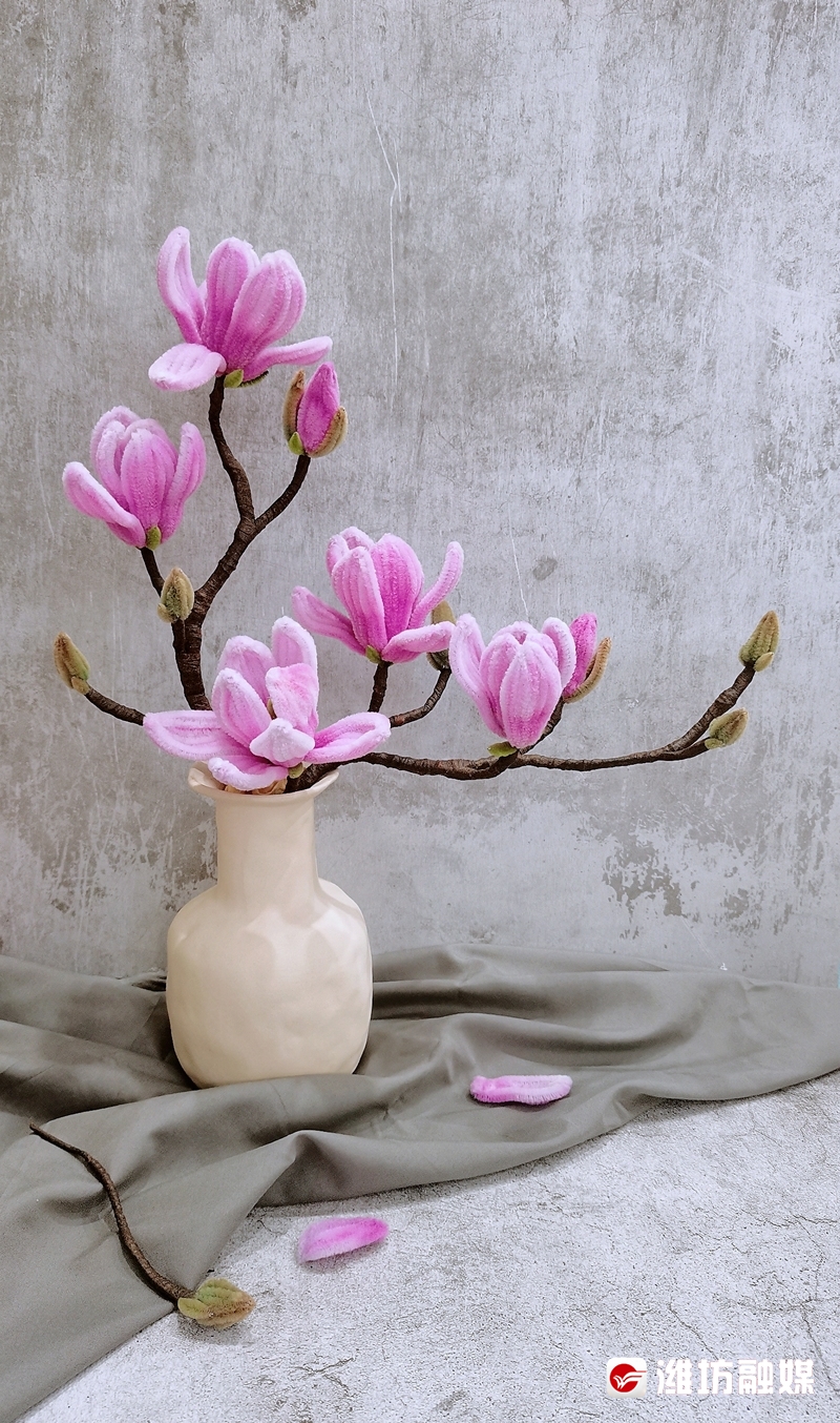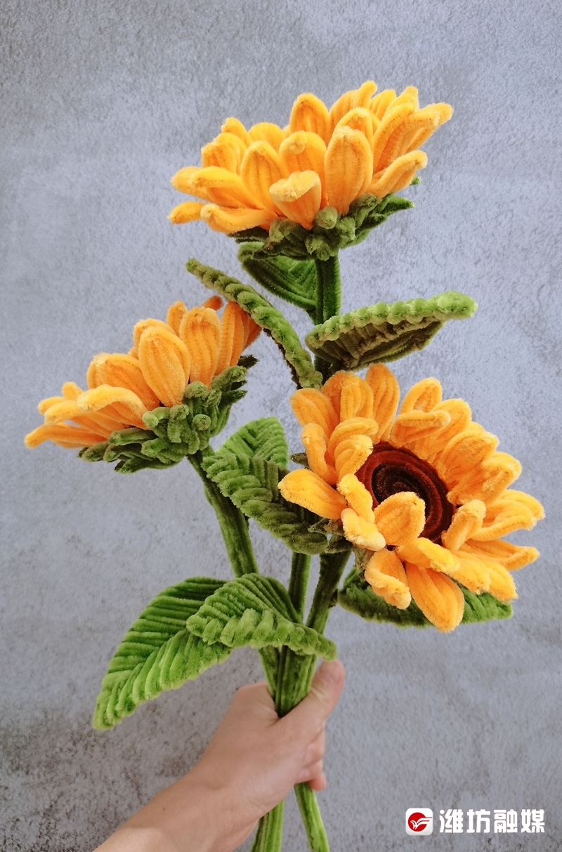 “扭扭棒是小朋友做手工会用到的东西,陪女儿做手工的时候我接触到了它,用它做出的手工花束十分精美。”王音波一边演示着一边说,“拿出一根扭扭棒,先折出花瓣形状,再把花瓣顶端捏尖、打弯,然后塑造成半个花苞的形态,最后再与之前做好的半个花苞粘在一起,一枝花就做好了。”