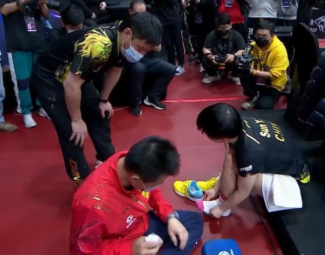 不过第二局后孙颖莎左脚出现不适,紧急接受队医治疗,左脚缠上了厚厚的肌贴。