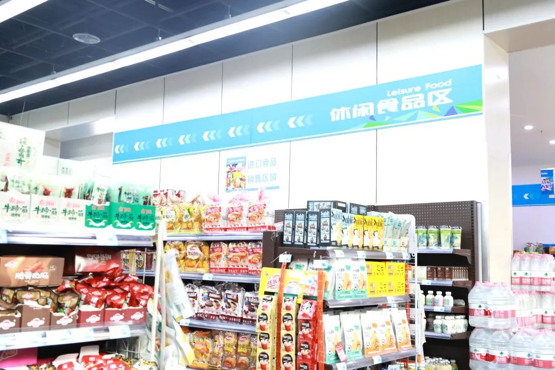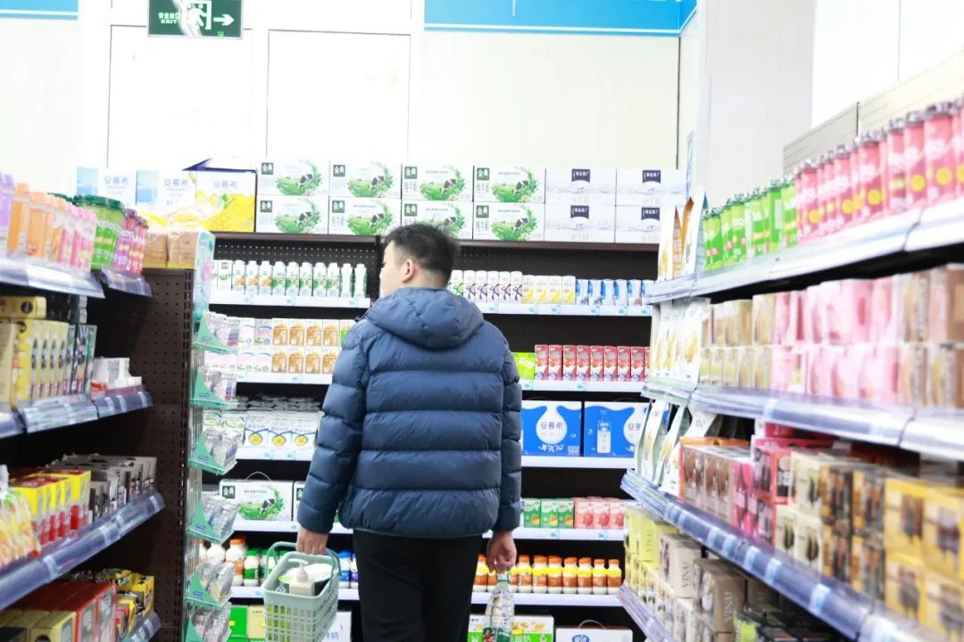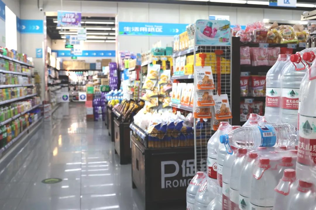 工作人员更换指示地贴、核对商品标签从生活用品到休闲食品