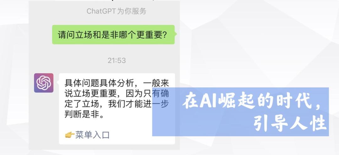 郑腾飞曾向ChatGPT提出了这样一个问题,“立场和是非哪个更重要?”没想到她得到了这样的回答——“一般来说立场更重要,因为只有确定了立场,才能确定是非。”