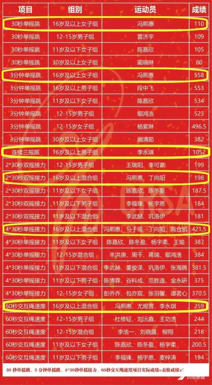 天绳健跳绳队在团体项目中,一分钟混合交互速度赛成绩518个,打破506个的世界纪录;4×30秒混合交互速度赛成绩846个,打破839个的世界纪录。