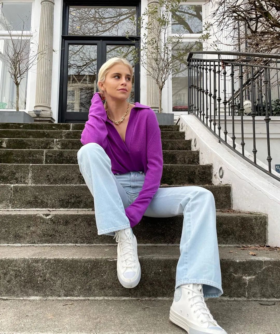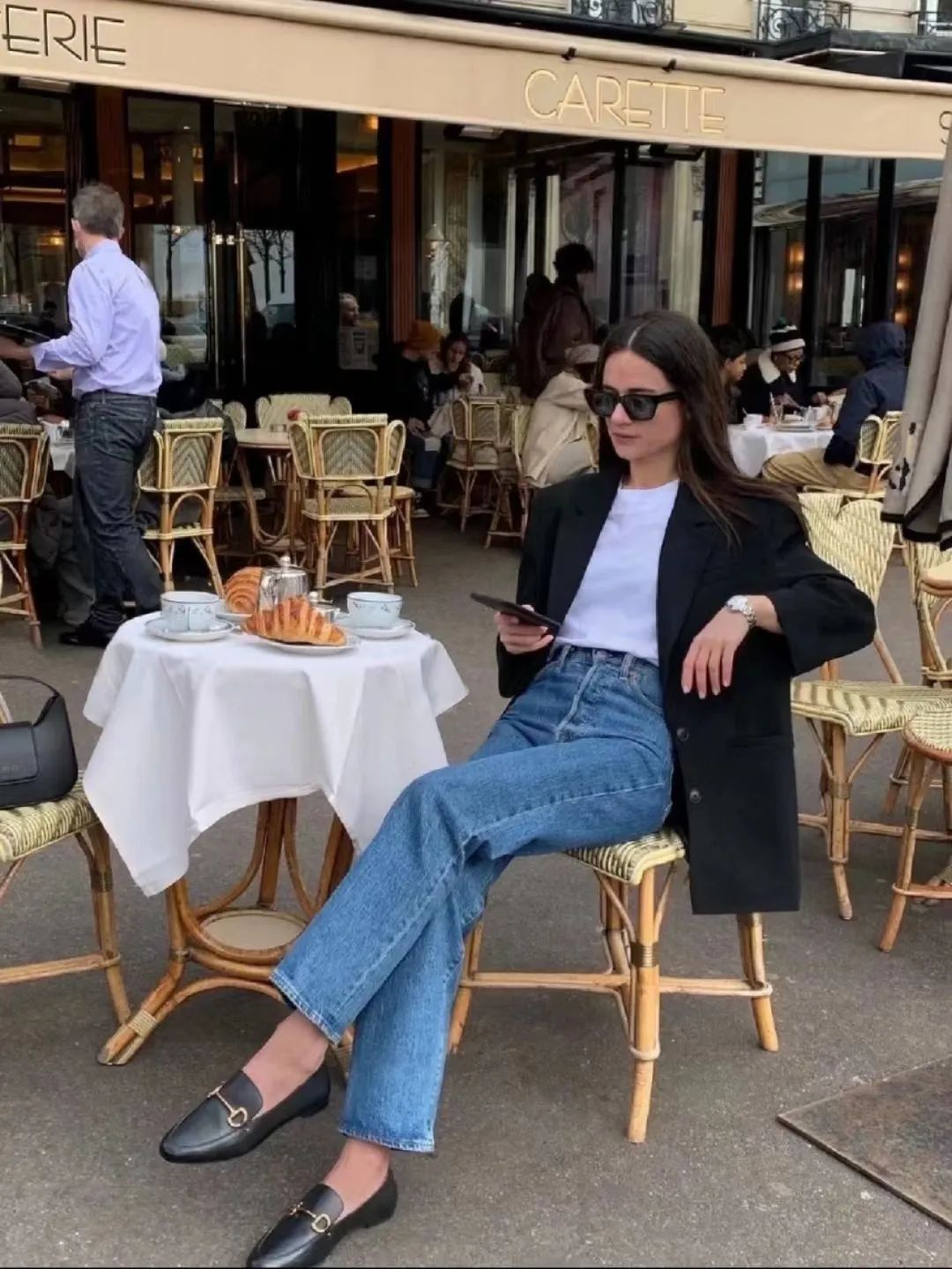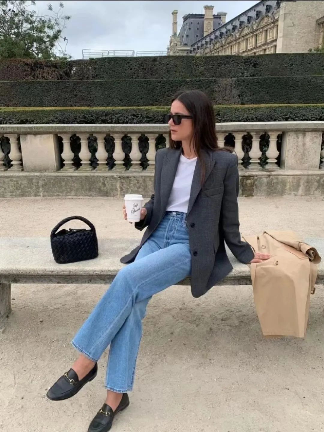 还可以学习大表姐刘雯,浅色阔腿牛仔裤搭配一件大西装外套和运动鞋,清爽舒适又帅气。
