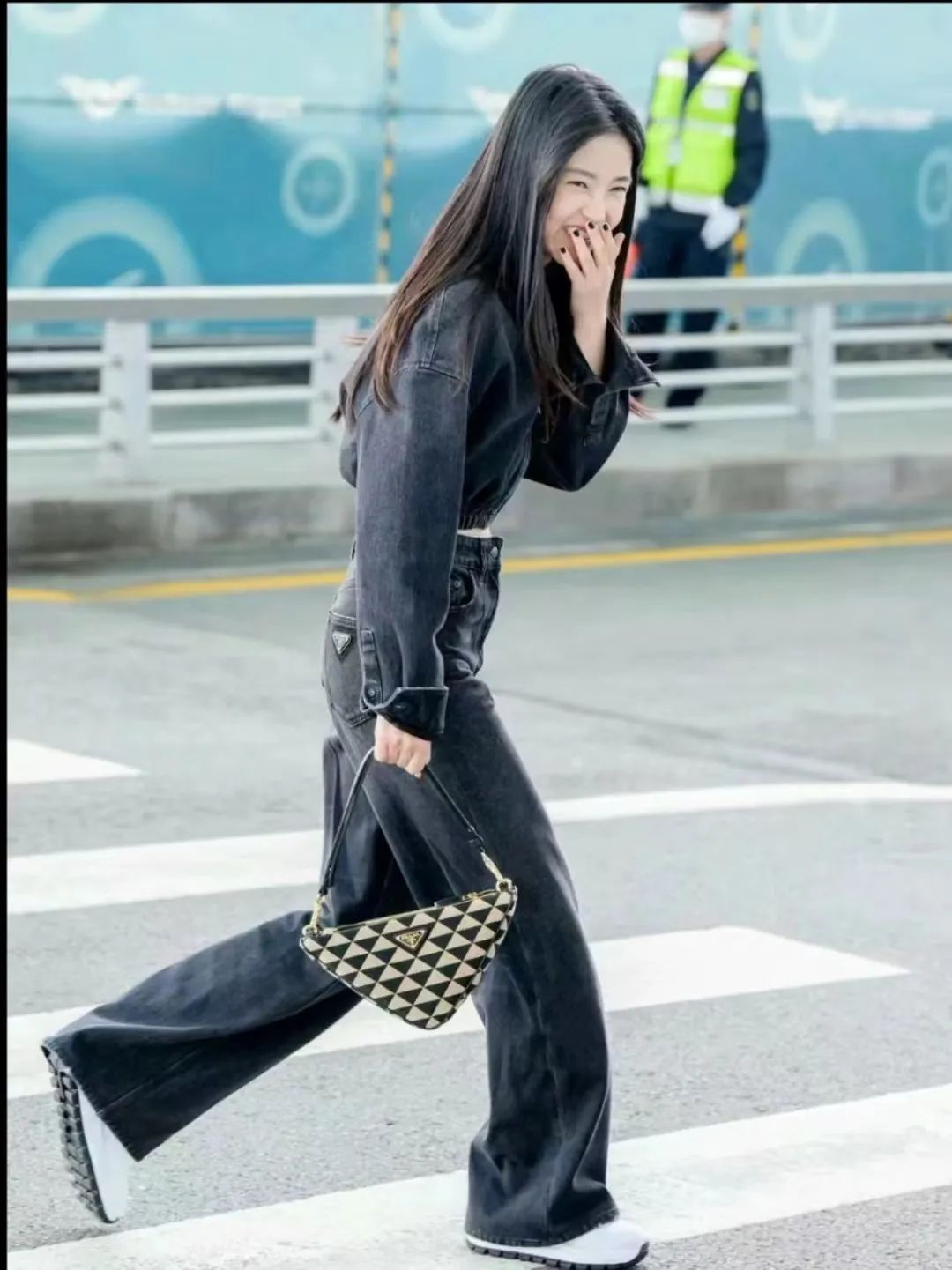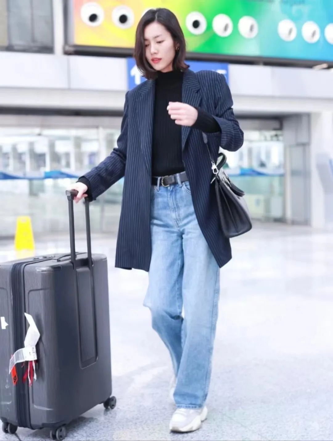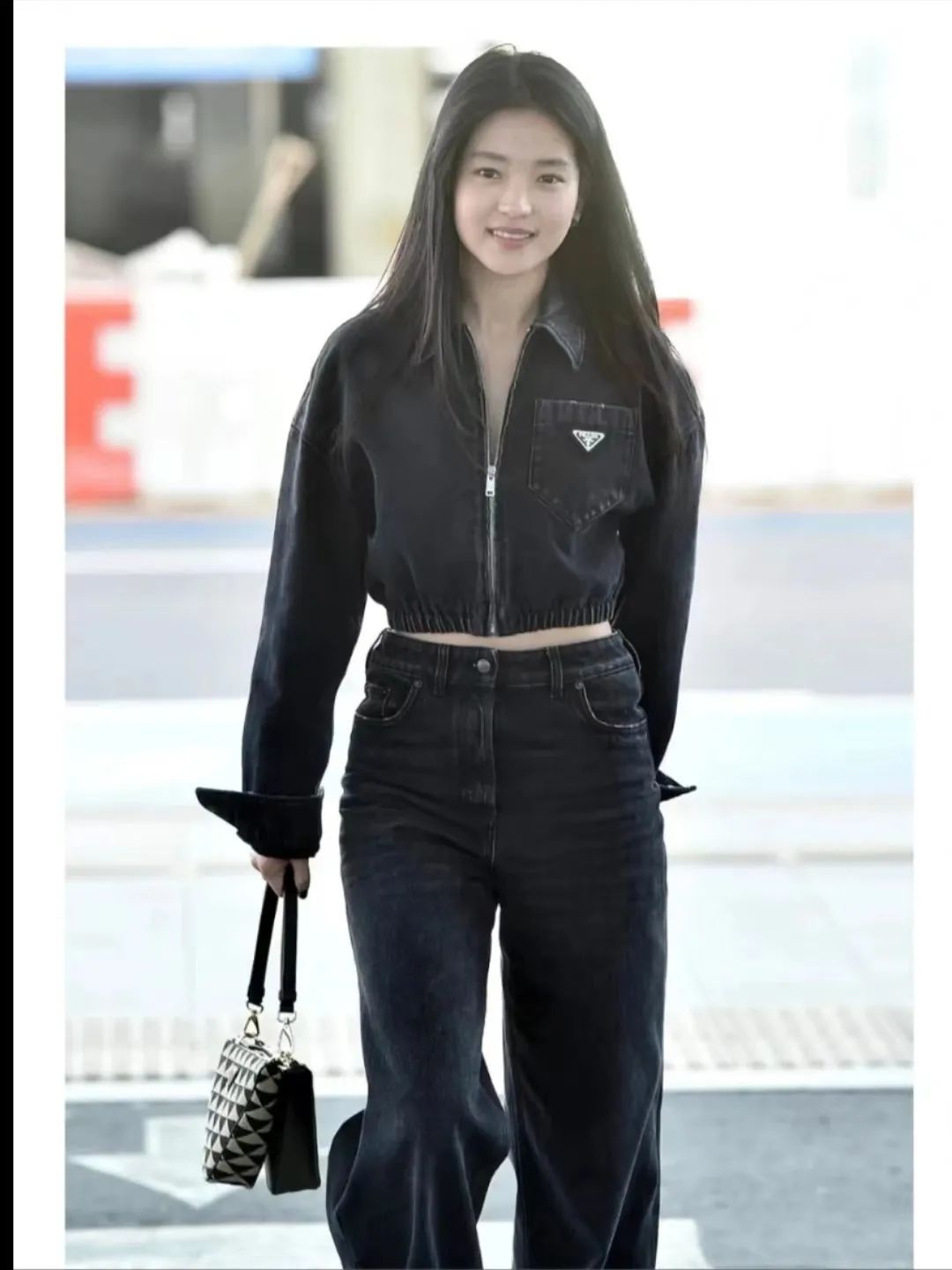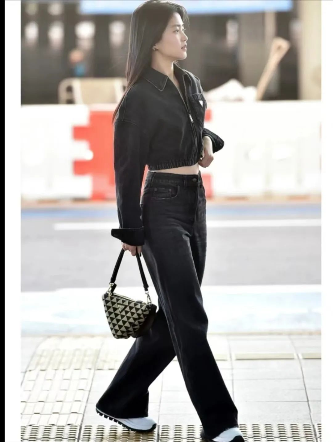金泰梨在机场的穿搭,黑色短款丹宁夹克搭配同色男友牛仔裤,清爽白色球鞋简约有活力。