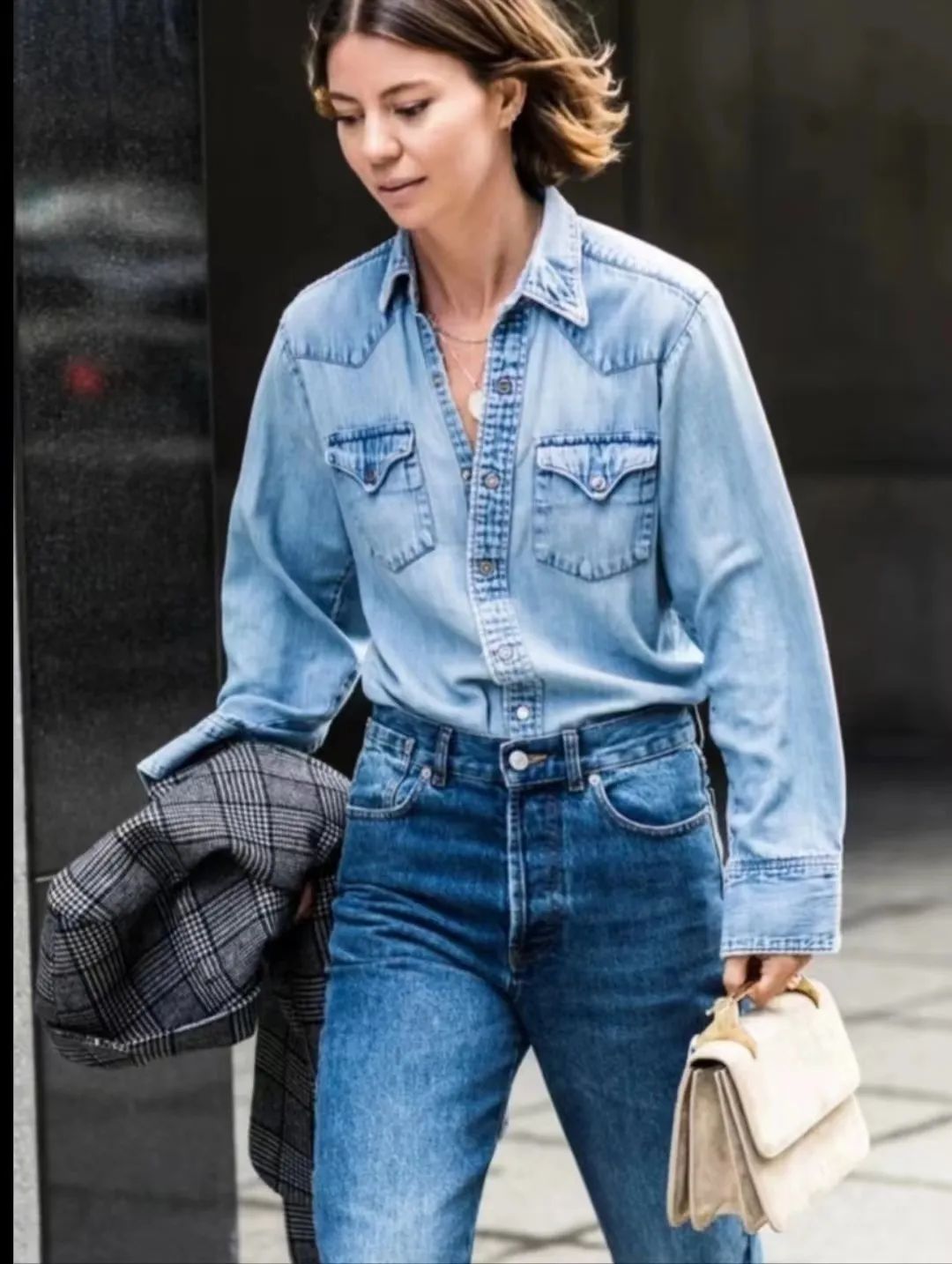 牛仔裤➕牛仔衬衣如果觉得牛仔外套太过厚重,也可以选择牛仔衬衣,利用轻薄的面料,也可以穿出牛仔的时髦感!