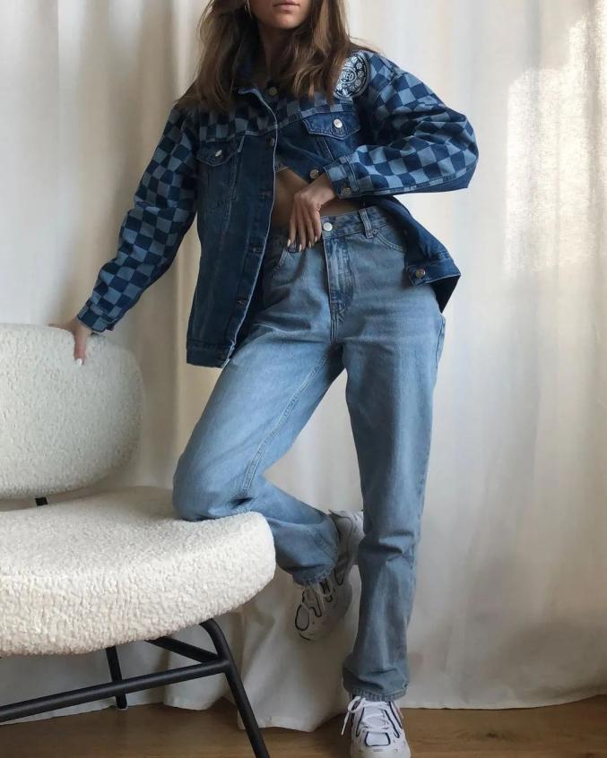 素色男友牛仔裤搭配上今年爆火的棋盘格牛仔外套,保留了牛仔的低调休闲感,又很有个性~