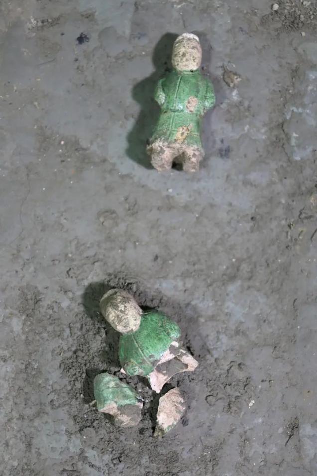 据介绍,在这批唐三彩中,“个头”最大的是天王俑,“身高”达到了近1米。天王俑怒目圆睁,右臂上扬,手部缺失,左手叉腰。身上的衣服呈现黄、绿、白等颜色,依然绚丽。整体制作非常精美,也非常有气势,属于唐三彩中的精品。还有两匹已经碎了的三彩马,虽然是已经是碎片,但依然能看出其完整时的气势。数量较多的是人俑,尺寸较小,保存也大都完好。记者在考古院看到了部分唐三彩,其中除了人俑外,还有鸡、马、狗、猪、羊等动物,以及井栏、仓房等模型,制作的也都非常精细,显示出这批唐三彩造型的多样性。