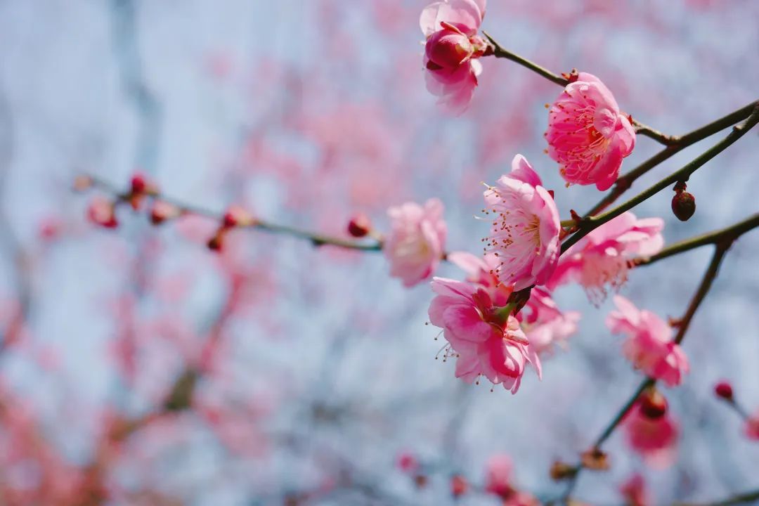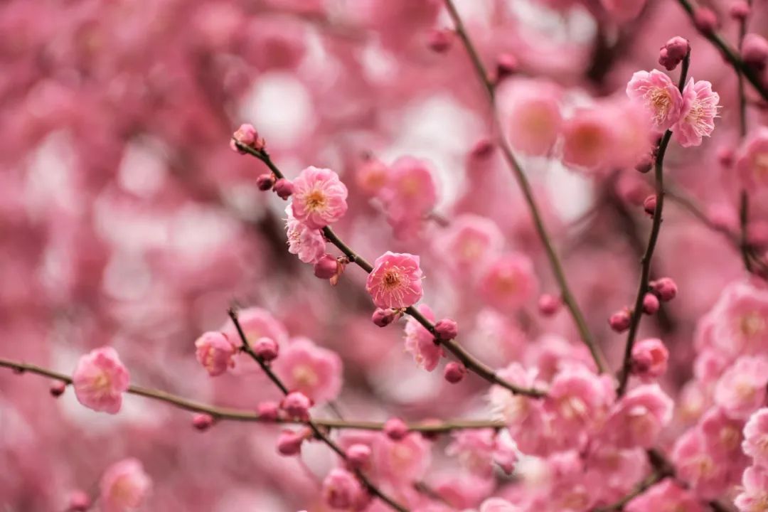 留下街道至真路上,红梅与绿萼梅如期盛放,近看如繁星在枝头交错点缀,粉艳艳的;远看如落英缤纷,好似一片“香雪海”。