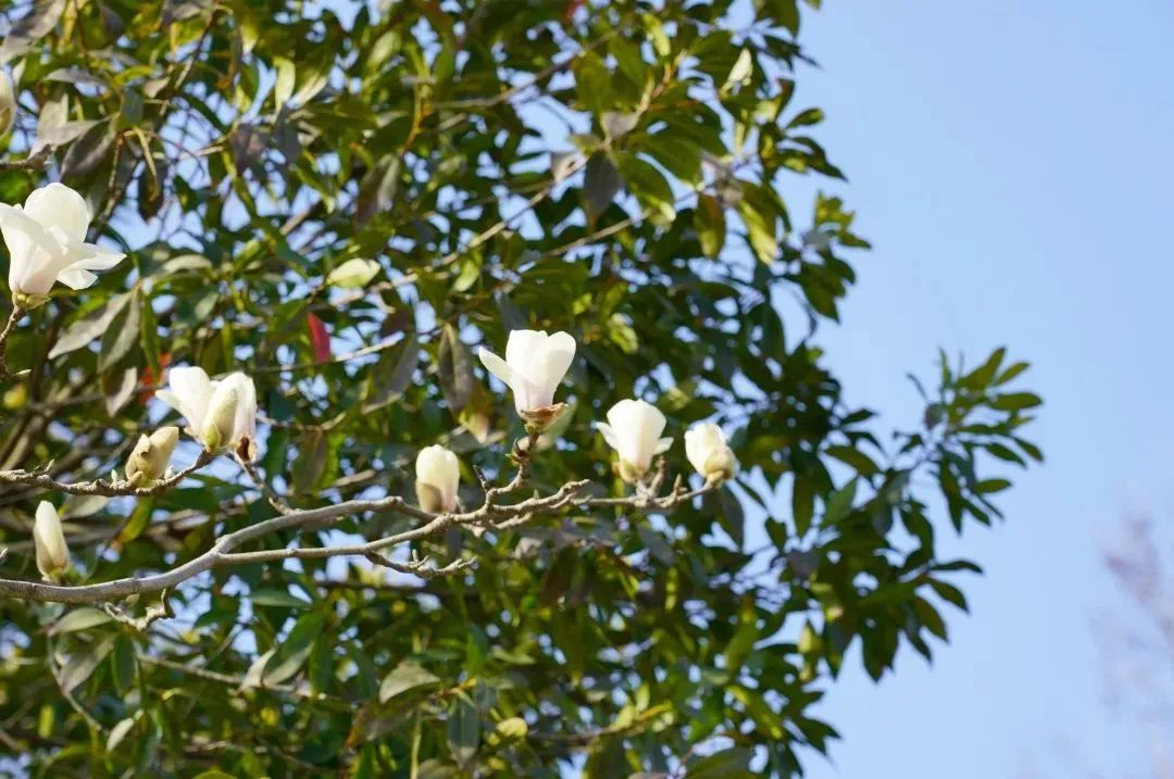 在钱塘区沿江湿地公园、月牙湖畔,白玉兰争相开放,微风吹来,摇曳的花朵伴随着丝丝清香,惹人喜爱。