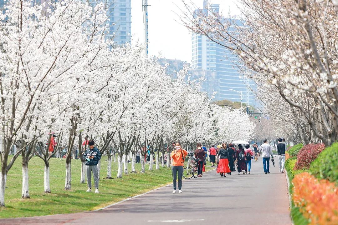 从东信大道西一直到闸站河,滨江樱花大道一路绵延7.4公里,贯穿钱江一桥、三桥与四桥,密密匝匝的粉白花簇,带来了千树万树的美丽与诗意。