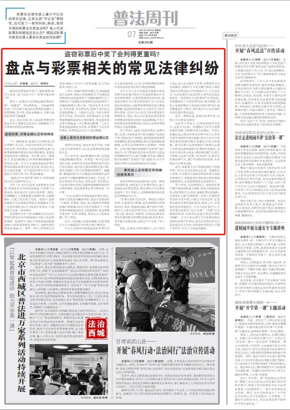 日前,密云法院投稿文章《盗窃彩票后中奖了会判得更重吗?盘点与彩票相关的常见法律纠纷》被民主与法制时报-普法周刊版面采用发布。偷来的彩票竟然中奖了,能够领取 100万元奖金,是行还是不行?答案可能会很“刑”。事实上,还真有人试图通过偷彩票来实现“一夜暴富”。其后果则是,一旦构成刑事犯罪,不但当事人偷来的彩票票面金额计入犯罪数额,若中奖,奖金金额越大,当事人面临的刑罚可能越重。近日,北京市密云区人民法院刑事审判庭法官苏小琴接受记者采访,详细解读了与彩票相关的常见法律纠纷。