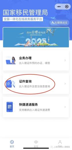 在微信搜索栏输入“移民局”,点击搜索,找到“移民局”小程序,打开小程序,点击“证件查询”。
