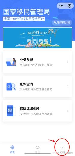 在微信搜索栏输入“移民局”,点击搜索,找到“移民局”小程序,打开小程序,点击右下角“我的”。