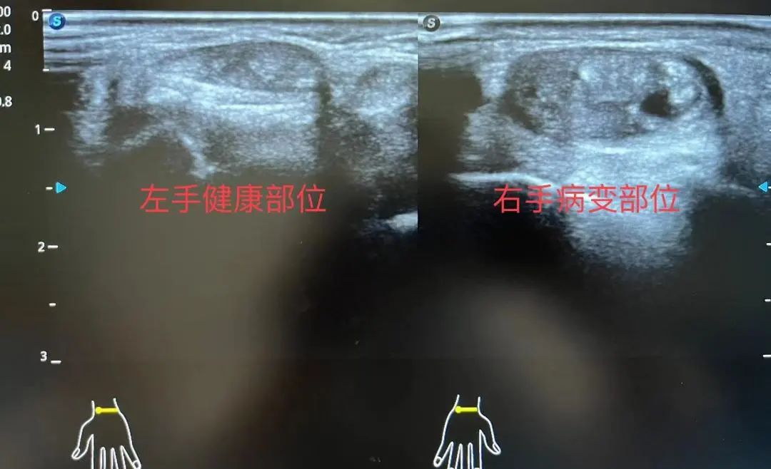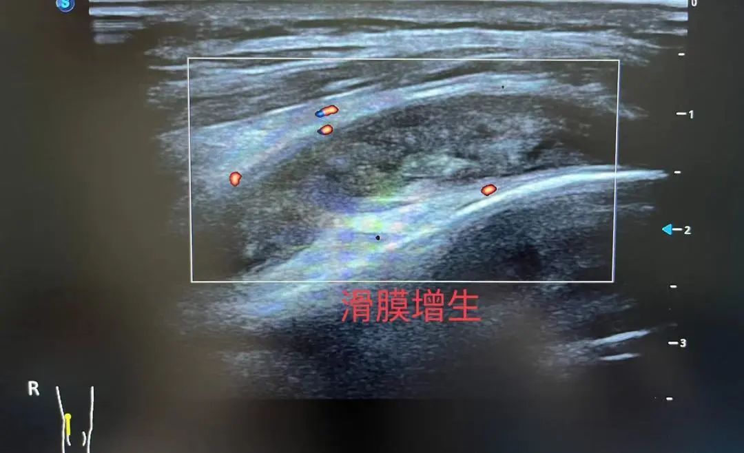 患者1:男 75岁 因手腕部疼痛来院检查,经肌骨超声检查发现该患者伸肌腱周围滑膜增生,周围可见积液。