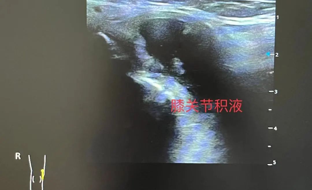 患者2:男 69岁 因疼痛行走困难来院检查,经肌骨超声检查发现该患者膝关节滑膜增生伴积液。