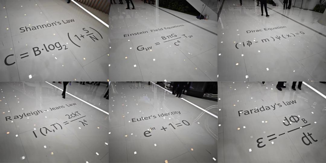 华为在展馆里还留了一个相当起眼的彩蛋,让差评君看到之后感慨良多。在展厅中央的迎宾走廊上,华为展示了一串串的数学公式和定理,从信息学之父香农的香农定理到高斯定律,再到多普勒频移、信息熵、法拉第定理、弗林斯传输方程、德布罗意公式等等。