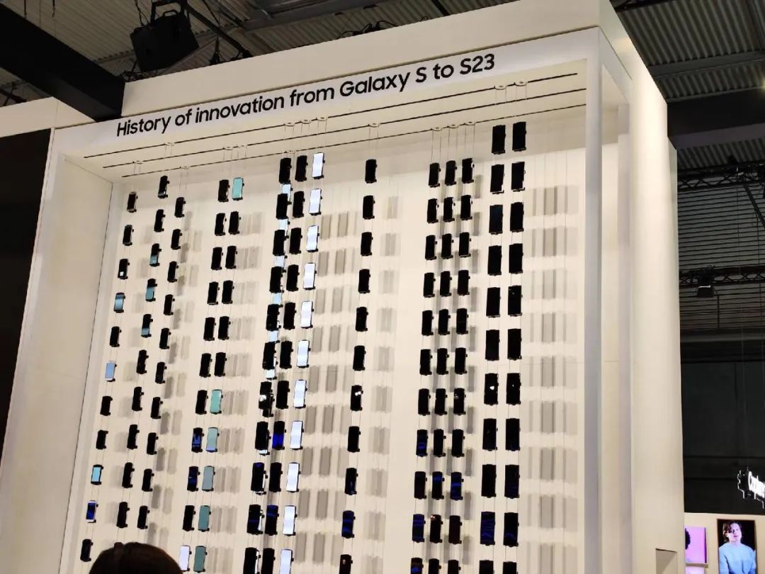 门口的 ♾️ 标志是为了凸显自己在环保上做的努力,背后则是用历代的 S 系列手机做了一堵墙来当作主屏幕拓展显示的衍生。放心,S 系列没有 Note7,不会炸墙。。。 ▼
