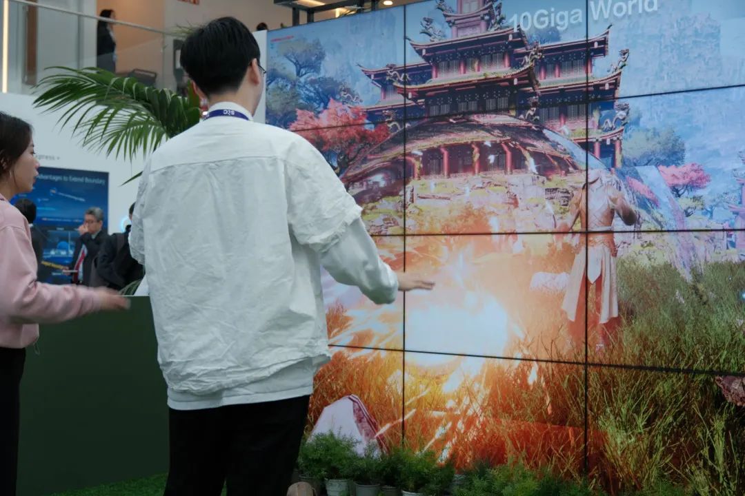 在展台的现场,华为还设置了一个 5.5G 时代的游戏体验装置。在摄像头扫描完玩家的身体之后,画面里的虚拟角色就可以和现实玩家同步活动,看上去延迟还蛮低的,动作的衔接也做的不错。