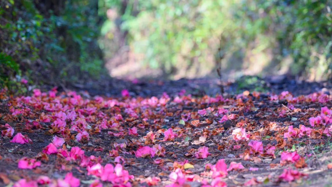 落满茶花的小道上,有女子着汉服与山茶同框,人与花一样娇嫩可爱。