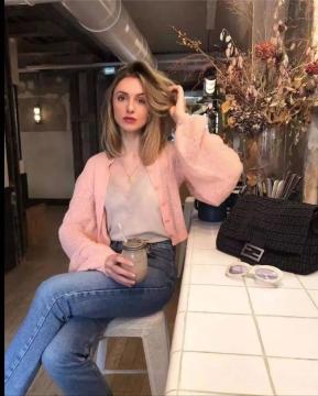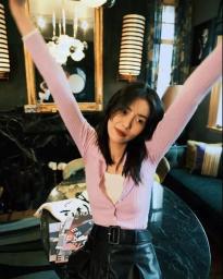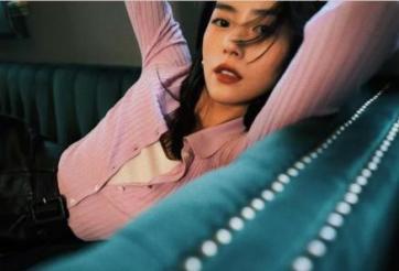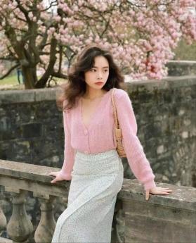 大表姐穿着一件粉色奶奶衫,内搭干净白T,解开几粒扣子,随性之余又多了几分俏皮性感。