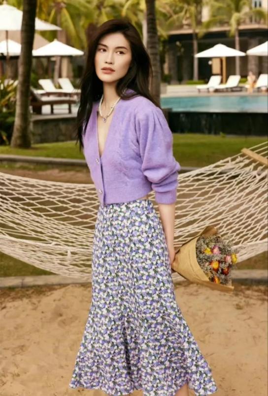 超模何穗也晒出了她的一组穿搭look,一件紫色针织奶奶衫软糯清新,搭配一条碎花半裙,直接把春天“穿在身上”!
