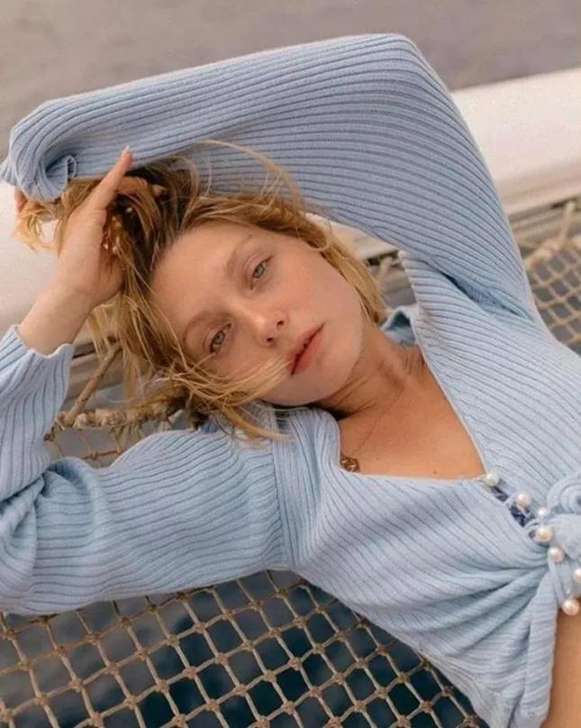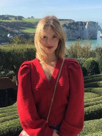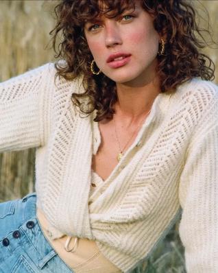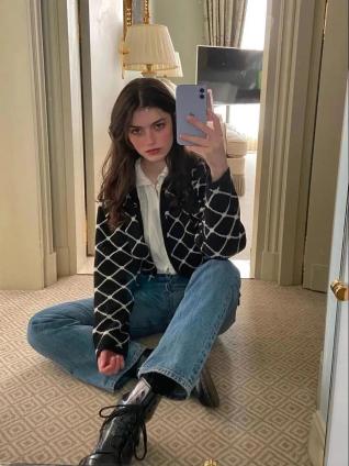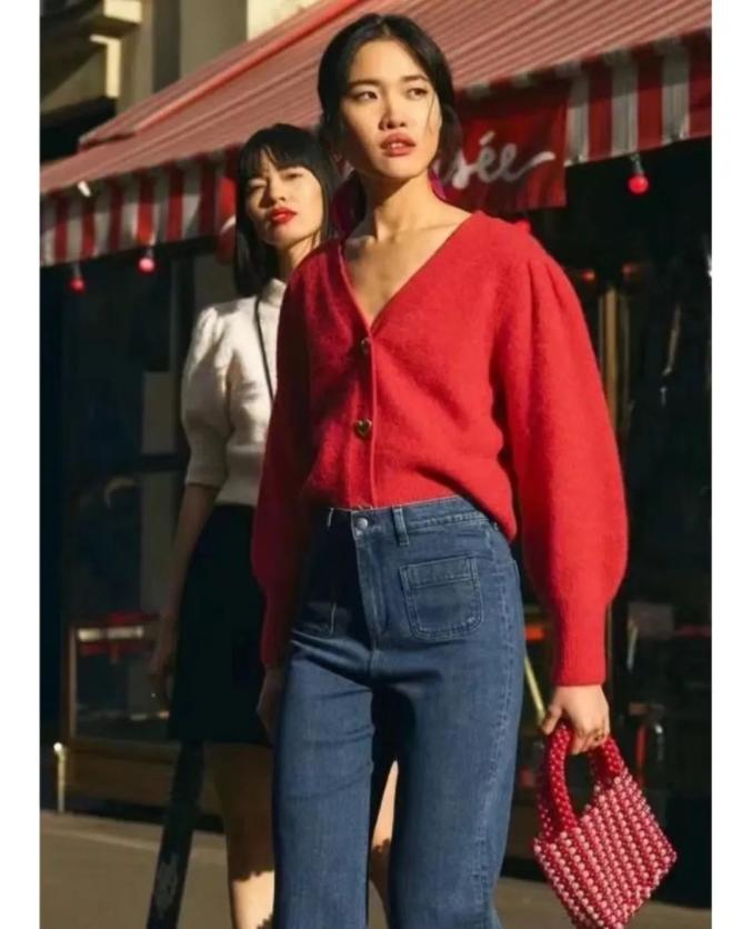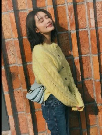 如果你想展示你引以为傲的马甲线,也可以像像青蛙公主爱凌一样,奶奶衫的纽扣薄针织解开几颗,再搭配一条高腰裤,俏皮又性感的Y2K风就拿捏了~